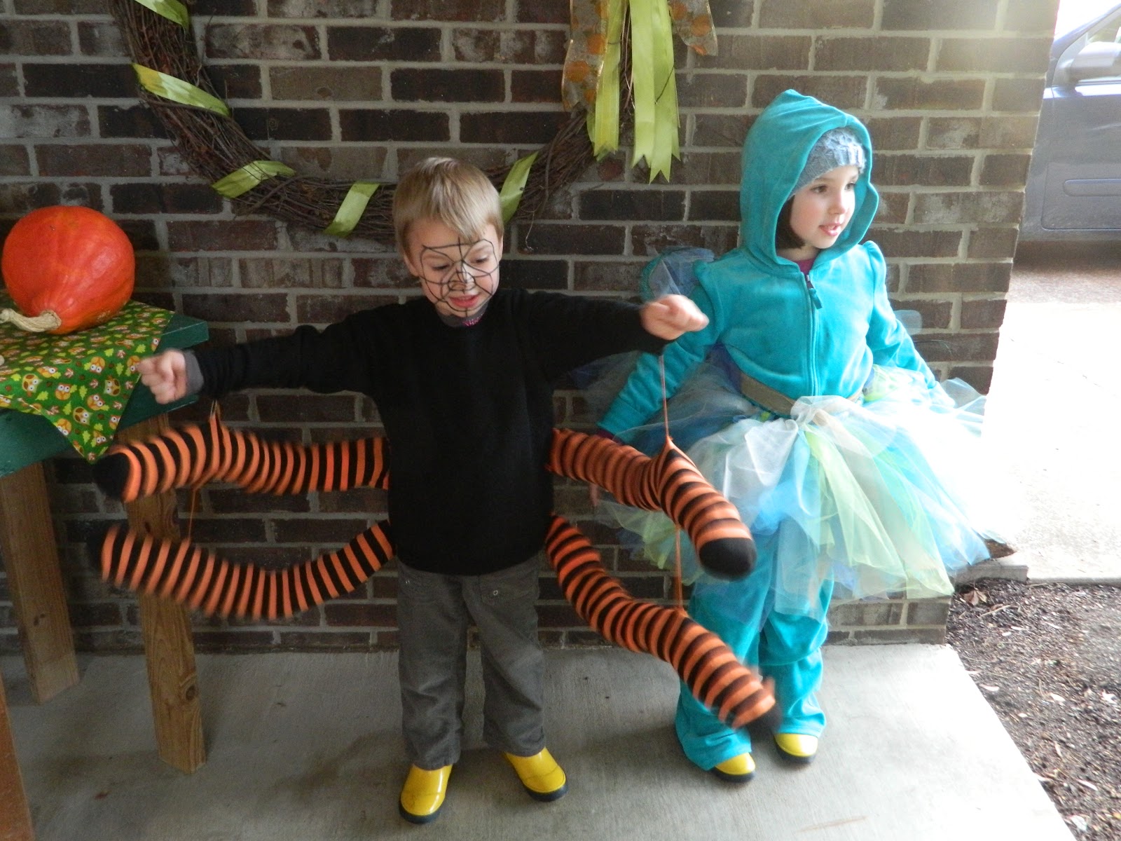 There is a chance that these are some of the worst costume photos you will see in blog land this year...the costumes however, are pretty fantastic (if I do say so myself!). Jenny requested a peacock...after a quick browse on pinterest I was sold on the idea of a tutu, it's just the basic "no sew" variety on elastic. We took several little feather bunches that were on sale (thankfully) at JoAnn's and I took them off of their wires and stitched them onto some sheer gold ribbon to be her tail. Bobby's spider legs are just halloween tights filled with plastic shopping bags, then strung together with thread (and by the end of the night at least one safety pin!)... Nomi (who is frequently called Domino by his sister) was, what else? A domino. And the cutest, plumpest domonio I've ever seen. My parent's house is in a great neighborhood for trick or treating, so we all meet up there and the cousins (and younger aunts and uncles!) all go together. It's also actually my sister's birthday so there are always at least a few birthday related things to do too. All in all it made for a fun (if chilly!) night, of fun for everyone. We don't make a huge deal about halloween, just good (not too scary please!) fun for all and a few days of much treasured candy treats.